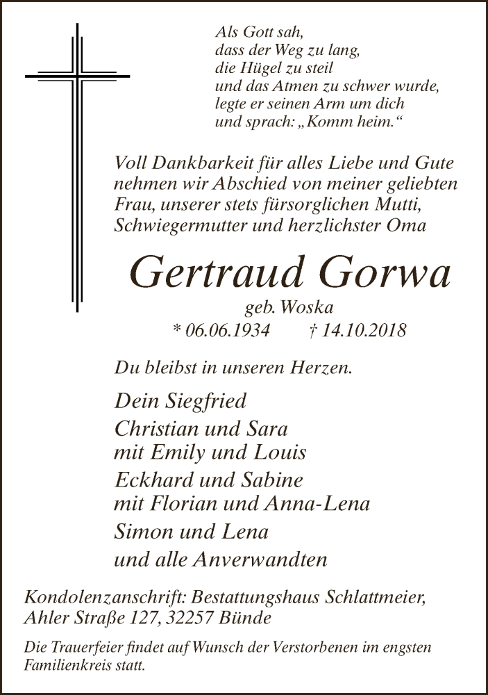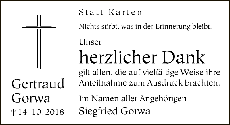 Hier finden Sie alle Traueranzeigen aus der Zeitung, die bisher für Gertraud Gorwa erschienen sind. Weitere Traueranzeigen, die in der Zeitung erscheinen, werden hier ebenfalls aufgelistet