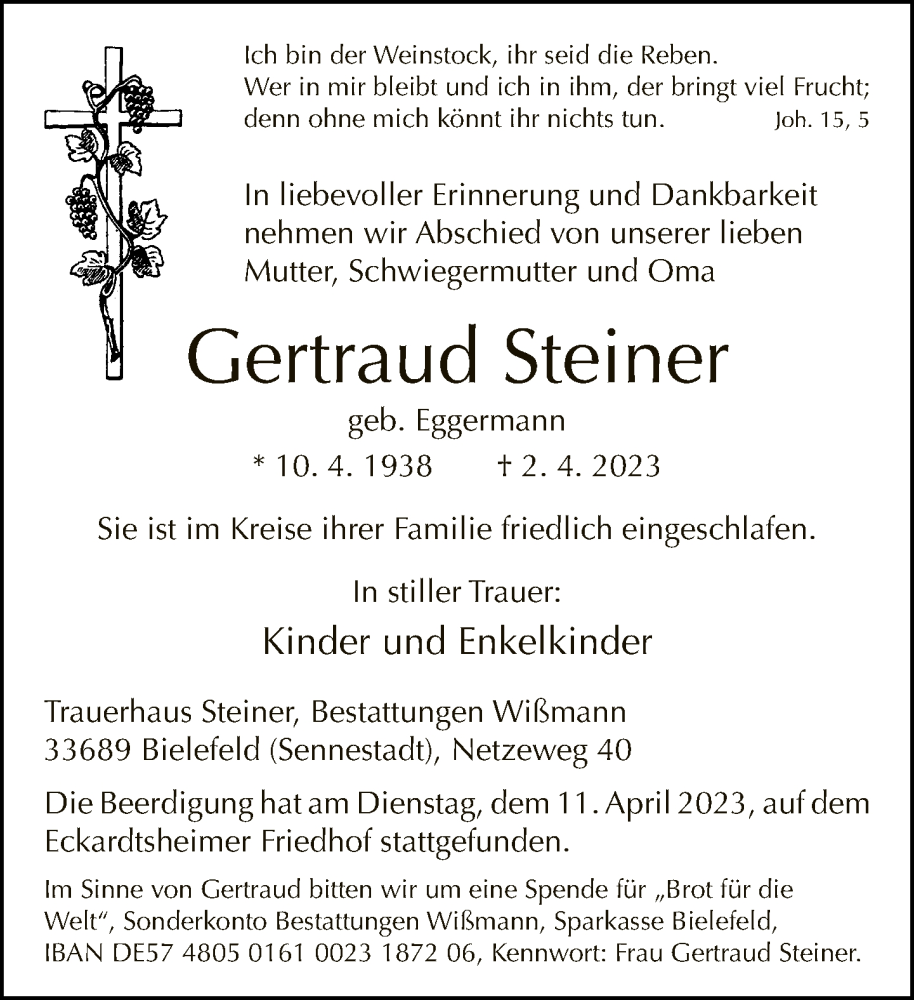 Hier finden Sie alle Traueranzeigen aus der Zeitung, die bisher für Gertraud Steiner erschienen sind. Weitere Traueranzeigen, die in der Zeitung erscheinen, werden hier ebenfalls aufgelistet