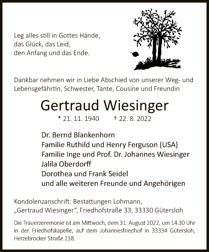 Hier finden Sie alle Traueranzeigen aus der Zeitung, die bisher für Gertraud Wiesinger erschienen sind. Weitere Traueranzeigen, die in der Zeitung erscheinen, werden hier ebenfalls aufgelistet