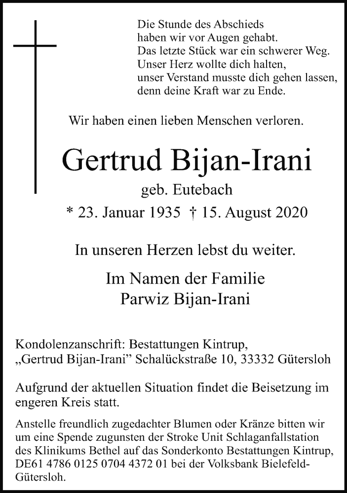 Hier finden Sie alle Traueranzeigen aus der Zeitung, die bisher für Gertrud Bijan-Irani erschienen sind. Weitere Traueranzeigen, die in der Zeitung erscheinen, werden hier ebenfalls aufgelistet