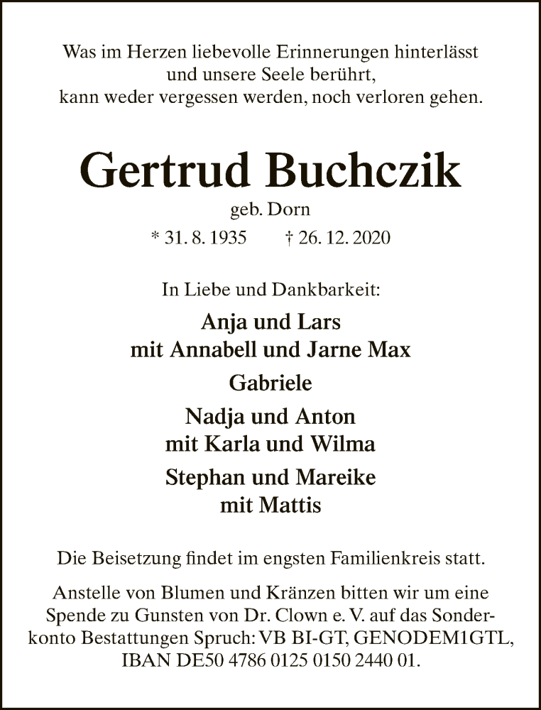 Hier finden Sie alle Traueranzeigen aus der Zeitung, die bisher für Gertrud Buchczik erschienen sind. Weitere Traueranzeigen, die in der Zeitung erscheinen, werden hier ebenfalls aufgelistet