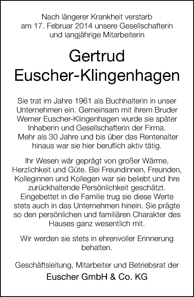 Hier finden Sie alle Traueranzeigen aus der Zeitung, die bisher für Gertrud Euscher-Klingenhagen erschienen sind. Weitere Traueranzeigen, die in der Zeitung erscheinen, werden hier ebenfalls aufgelistet