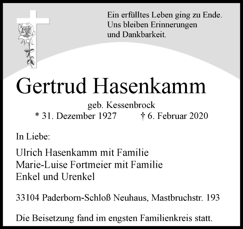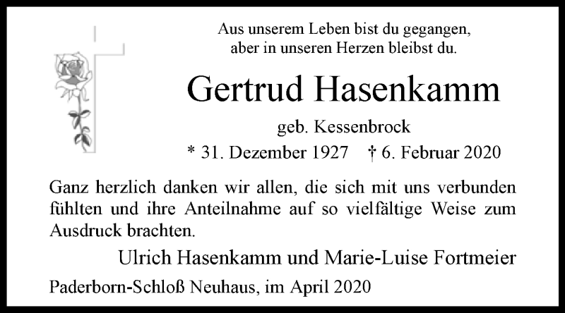 Hier finden Sie alle Traueranzeigen aus der Zeitung, die bisher für Gertrud Hasenkamm erschienen sind. Weitere Traueranzeigen, die in der Zeitung erscheinen, werden hier ebenfalls aufgelistet