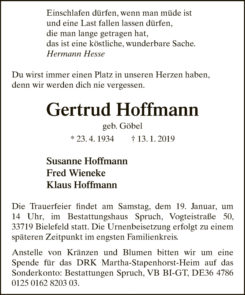Hier finden Sie alle Traueranzeigen aus der Zeitung, die bisher für Gertrud Hoffmann erschienen sind. Weitere Traueranzeigen, die in der Zeitung erscheinen, werden hier ebenfalls aufgelistet
