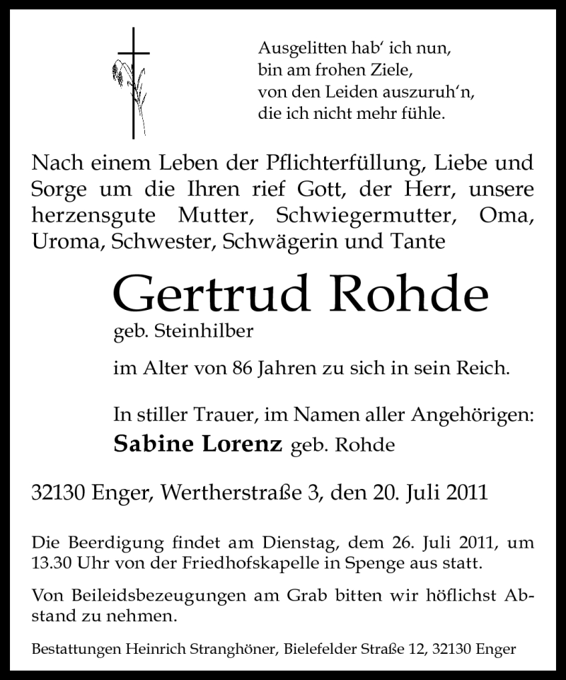 Hier finden Sie alle Traueranzeigen aus der Zeitung, die bisher für Gertrud Rohde erschienen sind. Weitere Traueranzeigen, die in der Zeitung erscheinen, werden hier ebenfalls aufgelistet