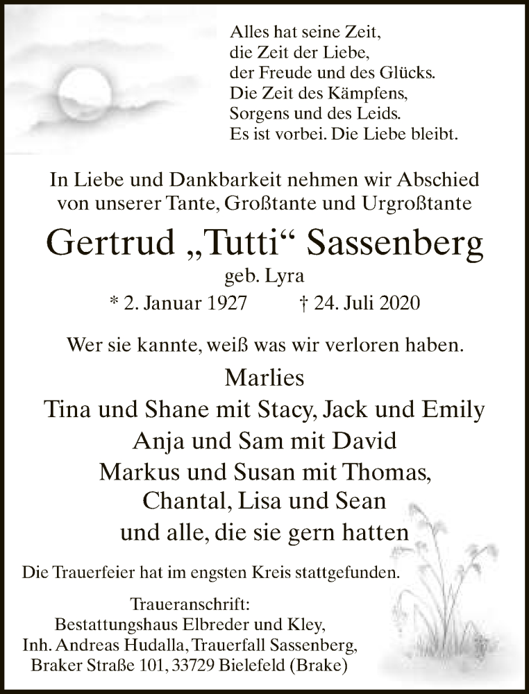 Hier finden Sie alle Traueranzeigen aus der Zeitung, die bisher für Gertrud Sassenberg erschienen sind. Weitere Traueranzeigen, die in der Zeitung erscheinen, werden hier ebenfalls aufgelistet