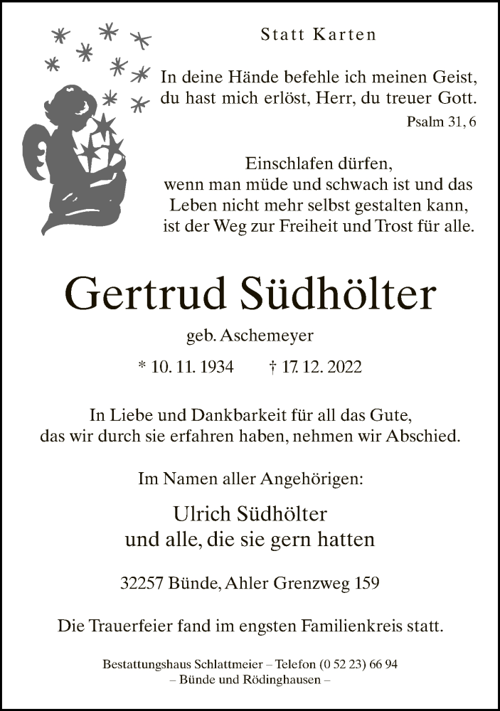 Hier finden Sie alle Traueranzeigen aus der Zeitung, die bisher für Gertrud Südhölter erschienen sind. Weitere Traueranzeigen, die in der Zeitung erscheinen, werden hier ebenfalls aufgelistet