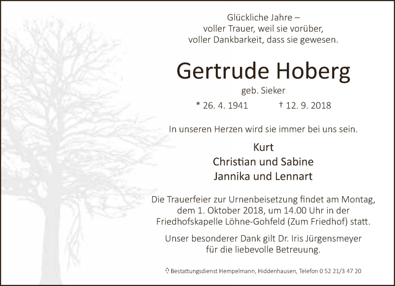 Hier finden Sie alle Traueranzeigen aus der Zeitung, die bisher für Gertrude Hoberg erschienen sind. Weitere Traueranzeigen, die in der Zeitung erscheinen, werden hier ebenfalls aufgelistet