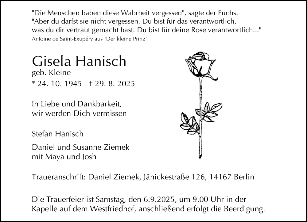 Hier finden Sie alle Traueranzeigen aus der Zeitung, die bisher für Gisela Hanisch erschienen sind. Weitere Traueranzeigen, die in der Zeitung erscheinen, werden hier ebenfalls aufgelistet