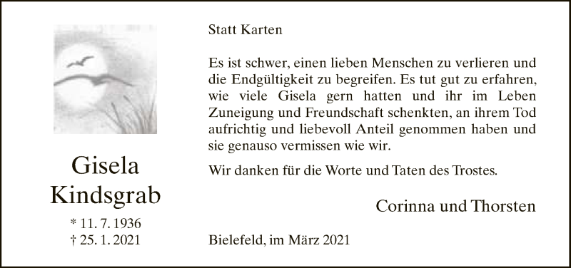 Hier finden Sie alle Traueranzeigen aus der Zeitung, die bisher für Gisela Kindsgrab erschienen sind. Weitere Traueranzeigen, die in der Zeitung erscheinen, werden hier ebenfalls aufgelistet