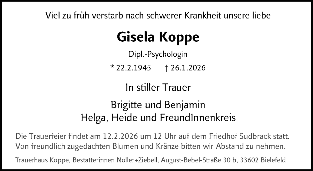 Hier finden Sie alle Traueranzeigen aus der Zeitung, die bisher für Gisela Koppe erschienen sind. Weitere Traueranzeigen, die in der Zeitung erscheinen, werden hier ebenfalls aufgelistet