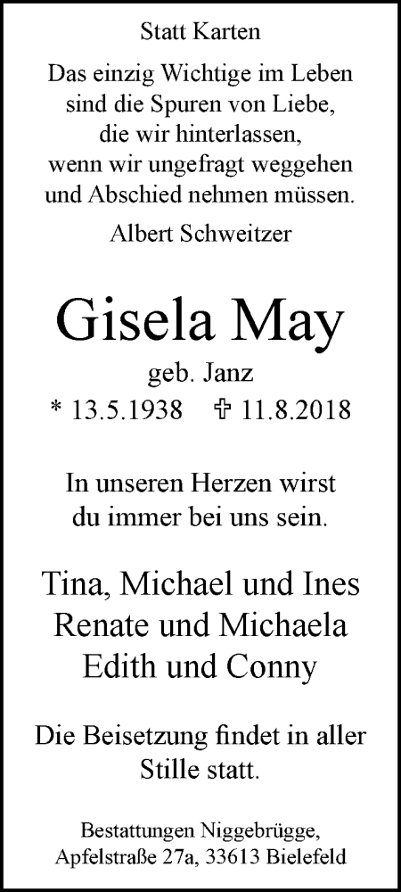 Hier finden Sie alle Traueranzeigen aus der Zeitung, die bisher für Gisela May erschienen sind. Weitere Traueranzeigen, die in der Zeitung erscheinen, werden hier ebenfalls aufgelistet