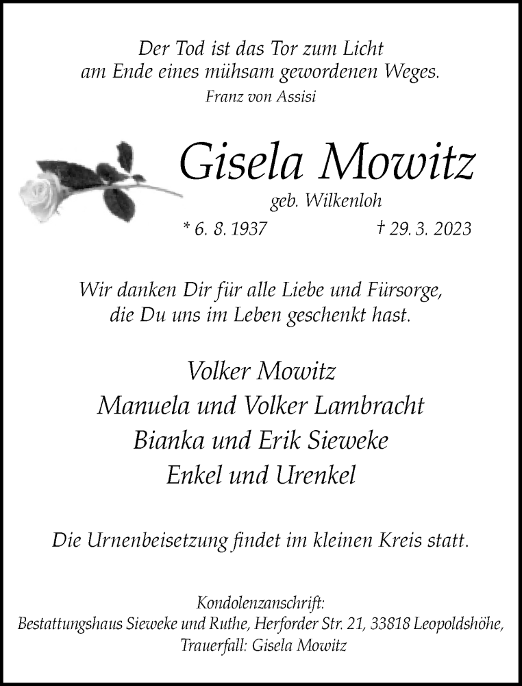 Hier finden Sie alle Traueranzeigen aus der Zeitung, die bisher für Gisela Mowitz erschienen sind. Weitere Traueranzeigen, die in der Zeitung erscheinen, werden hier ebenfalls aufgelistet