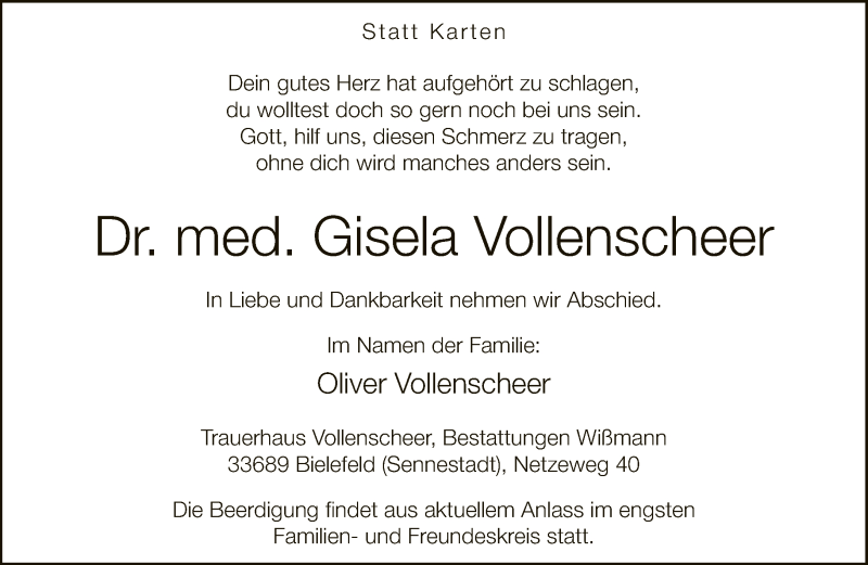 Hier finden Sie alle Traueranzeigen aus der Zeitung, die bisher für Gisela Vollenscheer erschienen sind. Weitere Traueranzeigen, die in der Zeitung erscheinen, werden hier ebenfalls aufgelistet