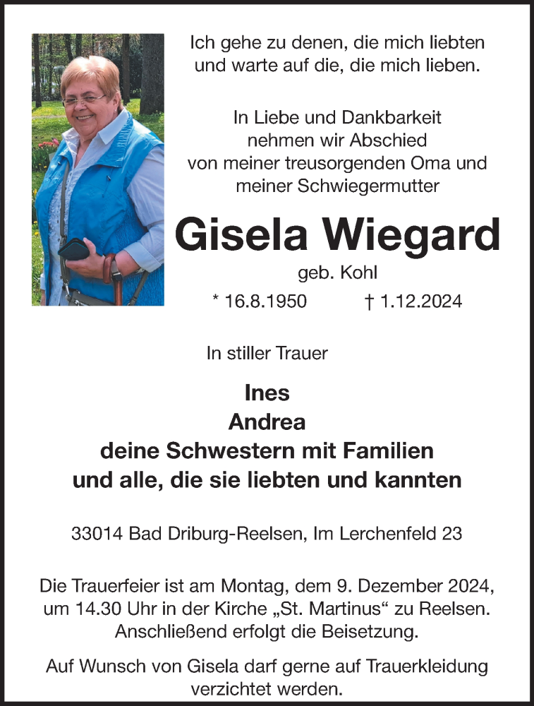 Hier finden Sie alle Traueranzeigen aus der Zeitung, die bisher für Gisela Wiegard erschienen sind. Weitere Traueranzeigen, die in der Zeitung erscheinen, werden hier ebenfalls aufgelistet