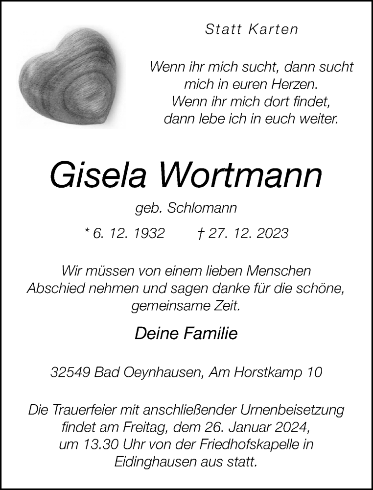 Hier finden Sie alle Traueranzeigen aus der Zeitung, die bisher für Gisela Wortmann erschienen sind. Weitere Traueranzeigen, die in der Zeitung erscheinen, werden hier ebenfalls aufgelistet