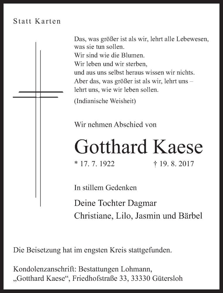 Hier finden Sie alle Traueranzeigen aus der Zeitung, die bisher für Gotthard Kaese erschienen sind. Weitere Traueranzeigen, die in der Zeitung erscheinen, werden hier ebenfalls aufgelistet