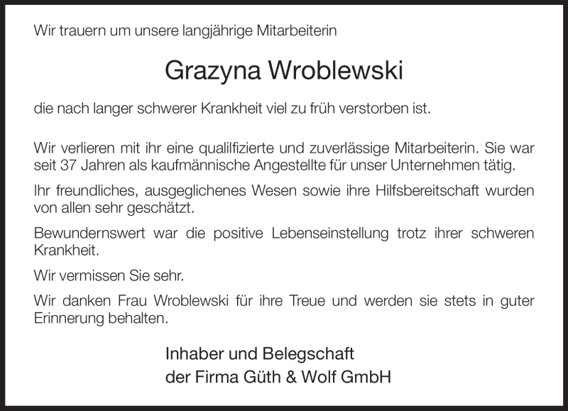 Hier finden Sie alle Traueranzeigen aus der Zeitung, die bisher für Grazyna Wroblewski erschienen sind. Weitere Traueranzeigen, die in der Zeitung erscheinen, werden hier ebenfalls aufgelistet