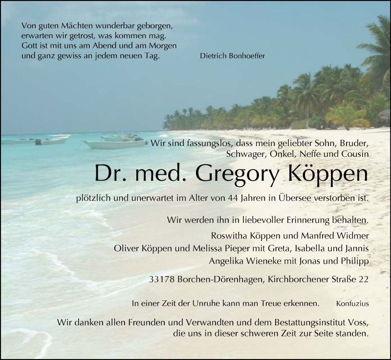 Hier finden Sie alle Traueranzeigen aus der Zeitung, die bisher für Gregory Köppen erschienen sind. Weitere Traueranzeigen, die in der Zeitung erscheinen, werden hier ebenfalls aufgelistet