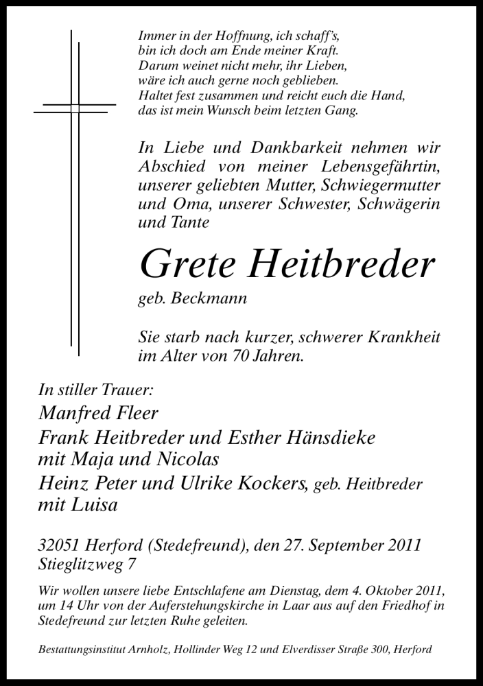 Hier finden Sie alle Traueranzeigen aus der Zeitung, die bisher für Grete Heitbreder erschienen sind. Weitere Traueranzeigen, die in der Zeitung erscheinen, werden hier ebenfalls aufgelistet