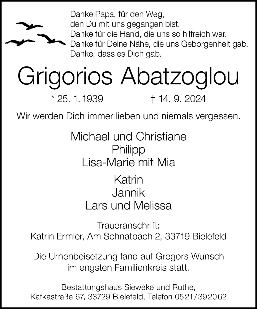 Hier finden Sie alle Traueranzeigen aus der Zeitung, die bisher für Grigorios Abatzoglou erschienen sind. Weitere Traueranzeigen, die in der Zeitung erscheinen, werden hier ebenfalls aufgelistet