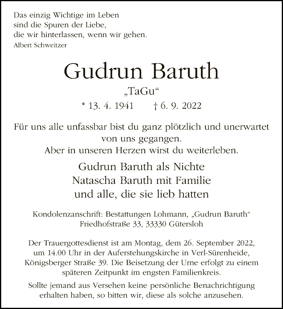 Hier finden Sie alle Traueranzeigen aus der Zeitung, die bisher für Gudrun Baruth erschienen sind. Weitere Traueranzeigen, die in der Zeitung erscheinen, werden hier ebenfalls aufgelistet