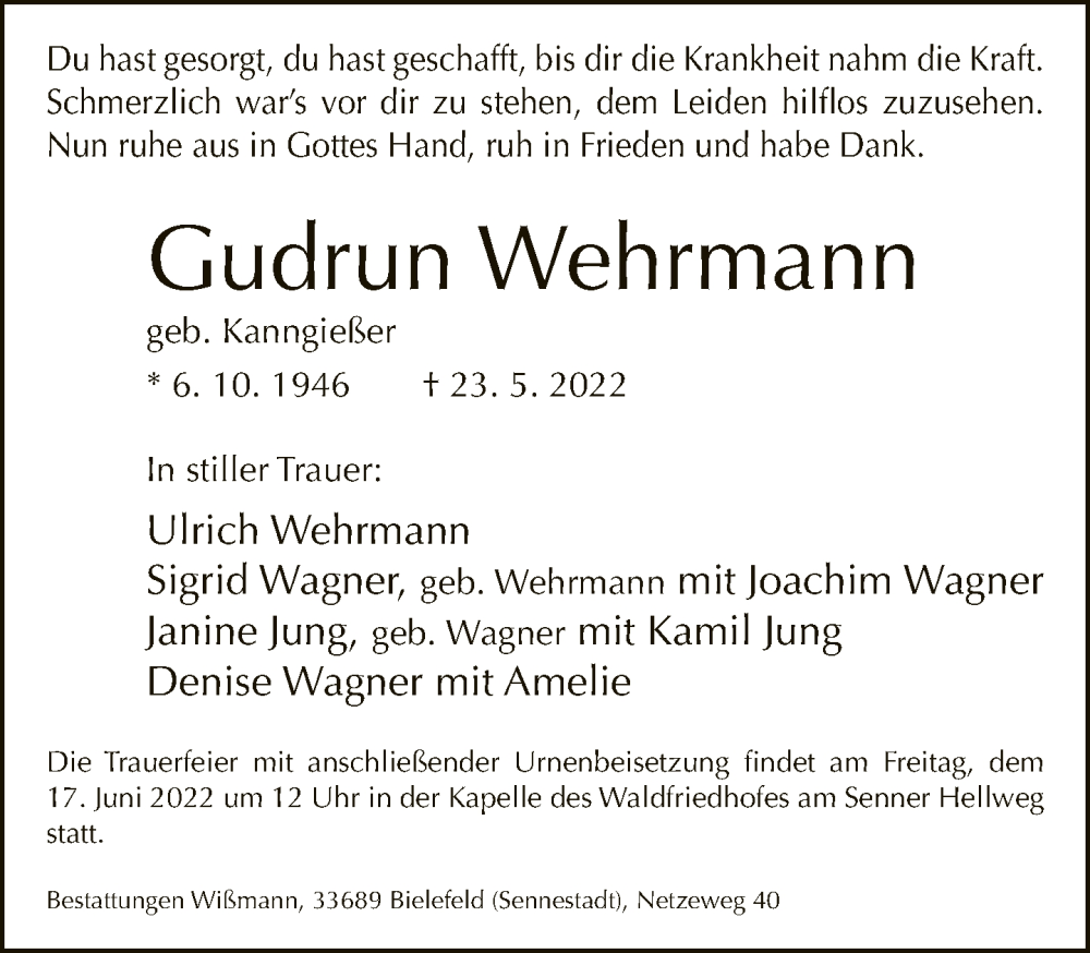 Hier finden Sie alle Traueranzeigen aus der Zeitung, die bisher für Gudrun Wehrmann erschienen sind. Weitere Traueranzeigen, die in der Zeitung erscheinen, werden hier ebenfalls aufgelistet