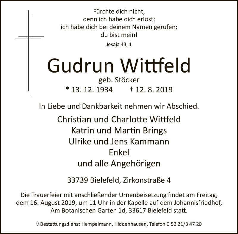 Hier finden Sie alle Traueranzeigen aus der Zeitung, die bisher für Gudrun Wittfeld erschienen sind. Weitere Traueranzeigen, die in der Zeitung erscheinen, werden hier ebenfalls aufgelistet