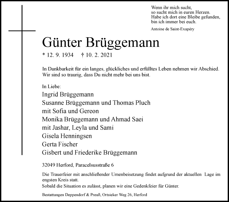 Hier finden Sie alle Traueranzeigen aus der Zeitung, die bisher für Günter Brüggemann erschienen sind. Weitere Traueranzeigen, die in der Zeitung erscheinen, werden hier ebenfalls aufgelistet