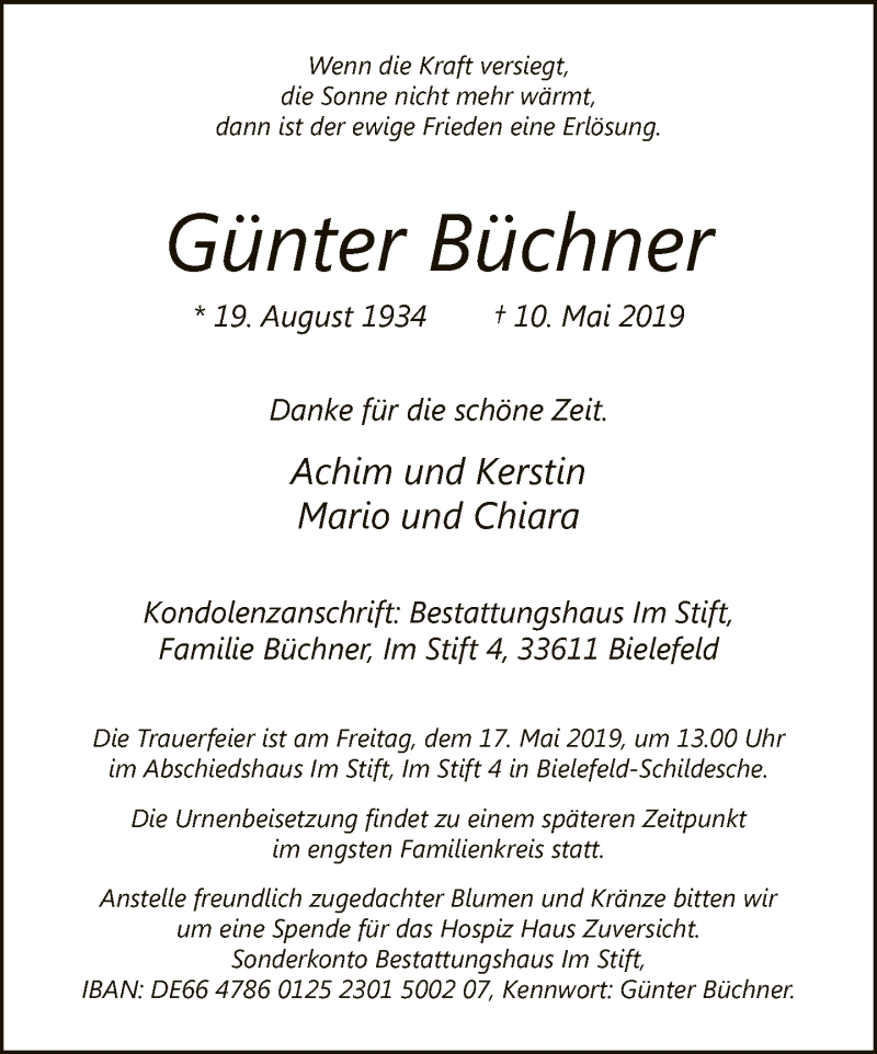 Hier finden Sie alle Traueranzeigen aus der Zeitung, die bisher für Günter Büchner erschienen sind. Weitere Traueranzeigen, die in der Zeitung erscheinen, werden hier ebenfalls aufgelistet