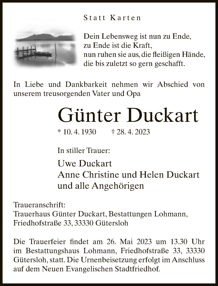 Hier finden Sie alle Traueranzeigen aus der Zeitung, die bisher für Günter Duckart erschienen sind. Weitere Traueranzeigen, die in der Zeitung erscheinen, werden hier ebenfalls aufgelistet