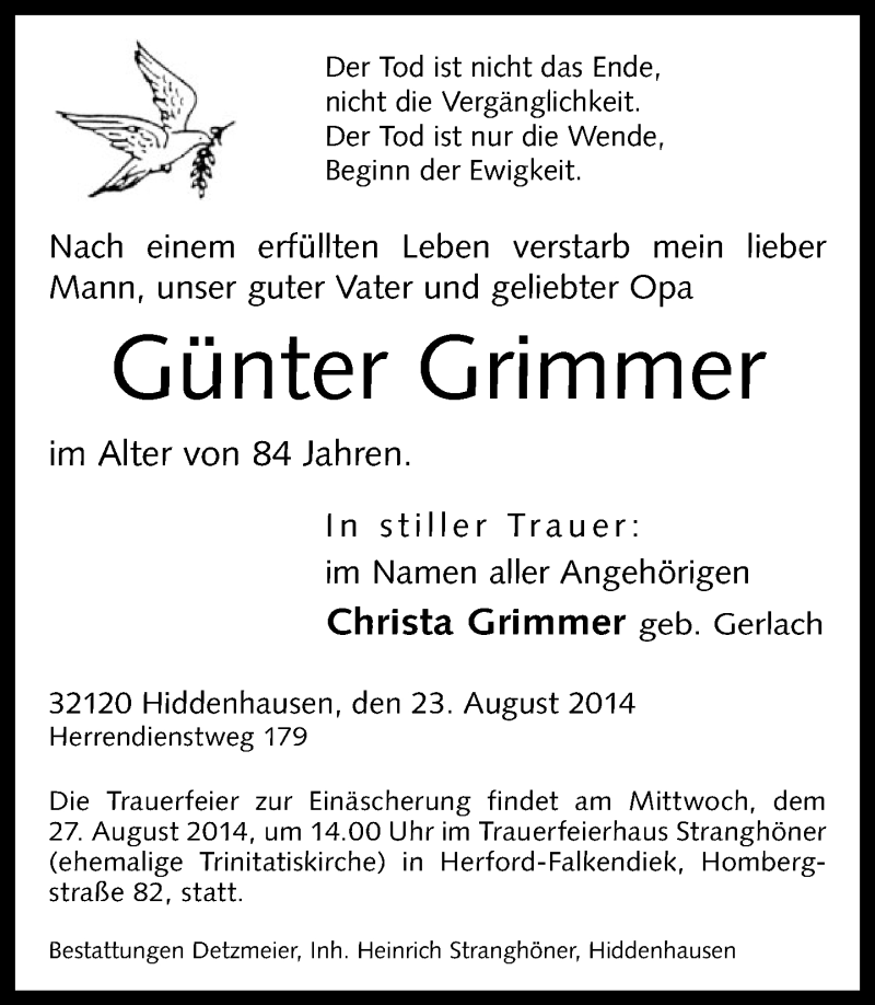 Hier finden Sie alle Traueranzeigen aus der Zeitung, die bisher für Günter Grimmer erschienen sind. Weitere Traueranzeigen, die in der Zeitung erscheinen, werden hier ebenfalls aufgelistet
