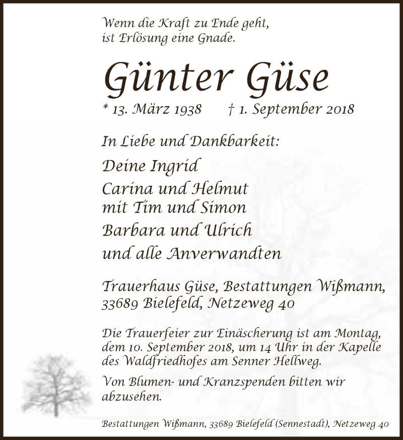 Hier finden Sie alle Traueranzeigen aus der Zeitung, die bisher für Günter Güse erschienen sind. Weitere Traueranzeigen, die in der Zeitung erscheinen, werden hier ebenfalls aufgelistet