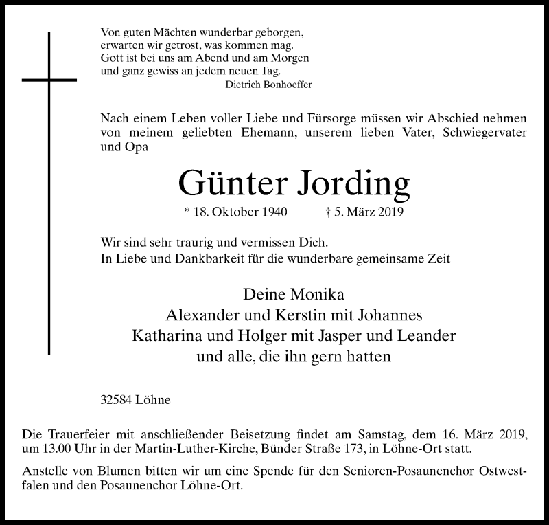 Hier finden Sie alle Traueranzeigen aus der Zeitung, die bisher für Günter Jording erschienen sind. Weitere Traueranzeigen, die in der Zeitung erscheinen, werden hier ebenfalls aufgelistet