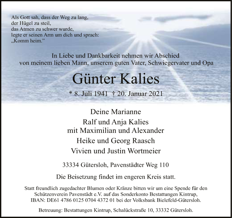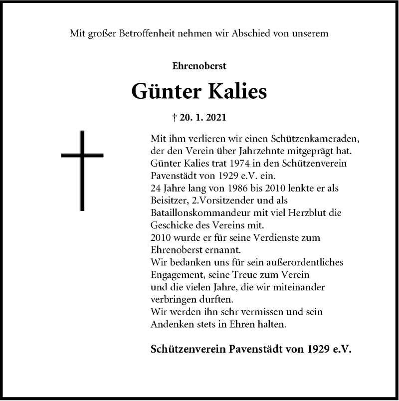 Hier finden Sie alle Traueranzeigen aus der Zeitung, die bisher für Günter Kalies erschienen sind. Weitere Traueranzeigen, die in der Zeitung erscheinen, werden hier ebenfalls aufgelistet