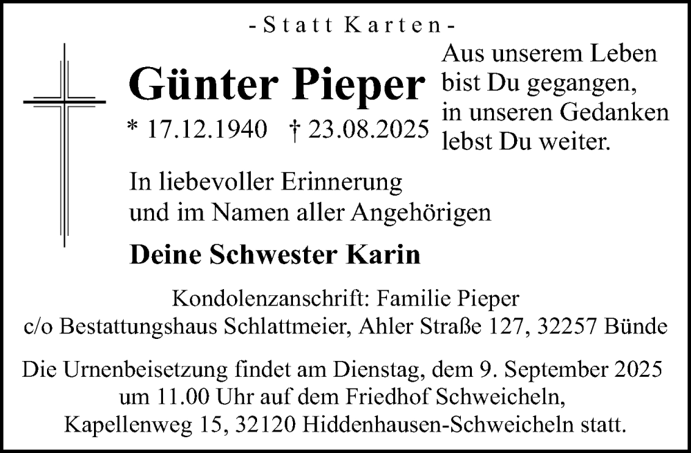 Hier finden Sie alle Traueranzeigen aus der Zeitung, die bisher für Günter Pieper erschienen sind. Weitere Traueranzeigen, die in der Zeitung erscheinen, werden hier ebenfalls aufgelistet