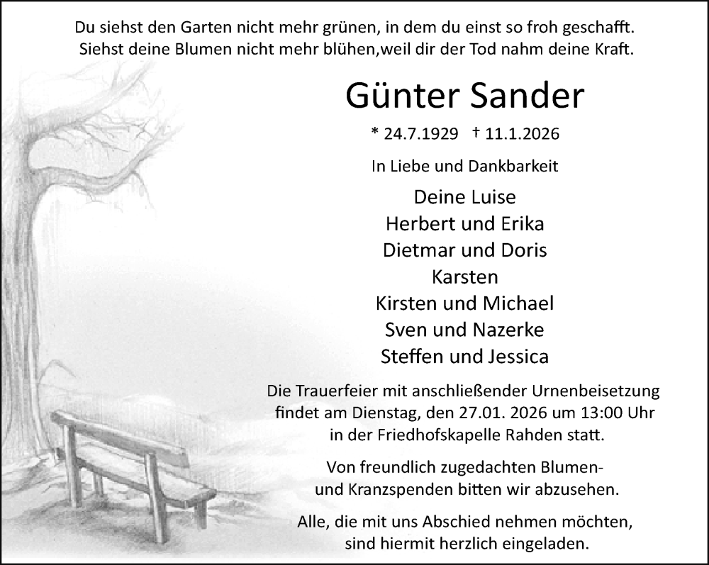 Hier finden Sie alle Traueranzeigen aus der Zeitung, die bisher für Günter Sander erschienen sind. Weitere Traueranzeigen, die in der Zeitung erscheinen, werden hier ebenfalls aufgelistet