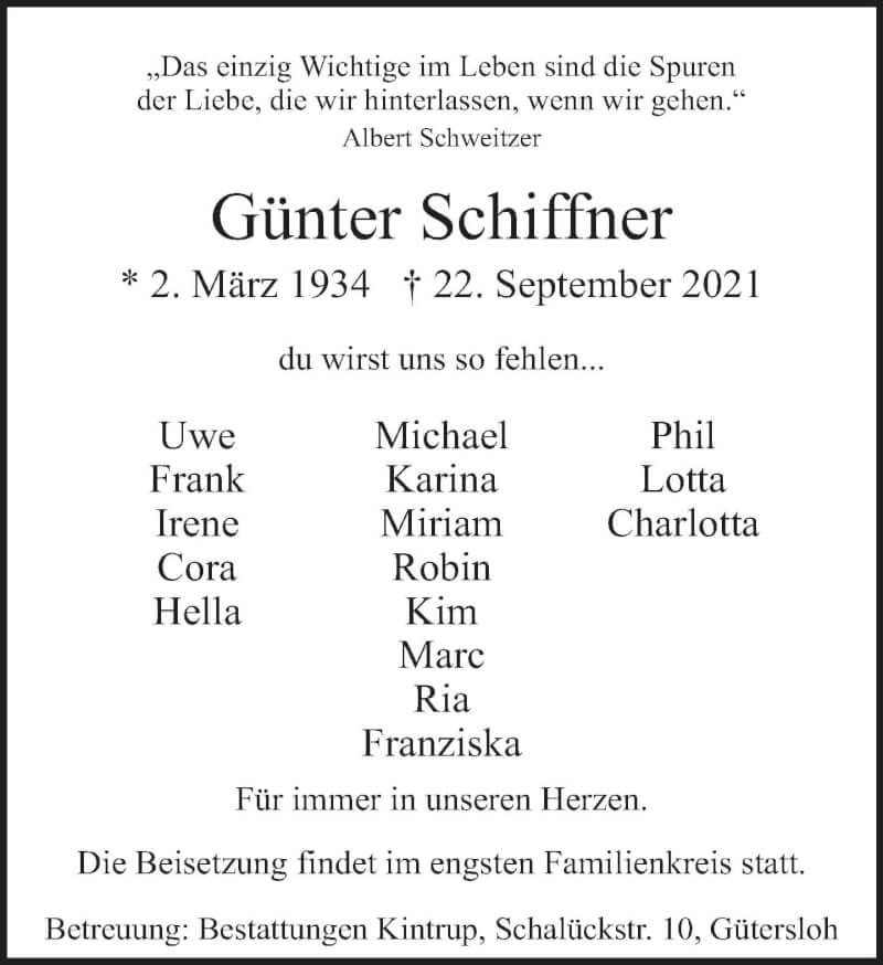 Hier finden Sie alle Traueranzeigen aus der Zeitung, die bisher für Günter Schiffner erschienen sind. Weitere Traueranzeigen, die in der Zeitung erscheinen, werden hier ebenfalls aufgelistet