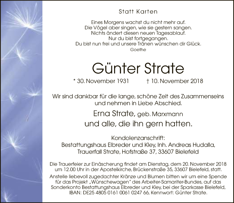 Hier finden Sie alle Traueranzeigen aus der Zeitung, die bisher für Günter Strate erschienen sind. Weitere Traueranzeigen, die in der Zeitung erscheinen, werden hier ebenfalls aufgelistet