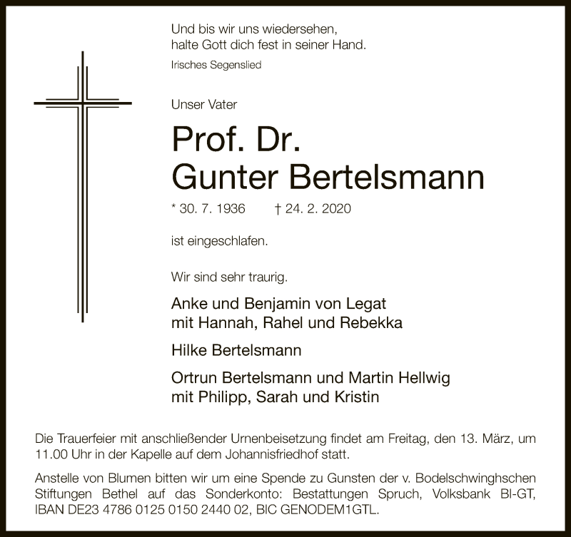 Hier finden Sie alle Traueranzeigen aus der Zeitung, die bisher für Gunter Bertelsmann erschienen sind. Weitere Traueranzeigen, die in der Zeitung erscheinen, werden hier ebenfalls aufgelistet