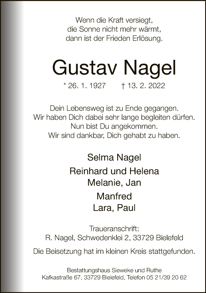 Hier finden Sie alle Traueranzeigen aus der Zeitung, die bisher für Gustav Nagel erschienen sind. Weitere Traueranzeigen, die in der Zeitung erscheinen, werden hier ebenfalls aufgelistet