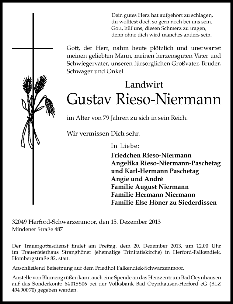 Hier finden Sie alle Traueranzeigen aus der Zeitung, die bisher für Gustav Rieso-Niermann erschienen sind. Weitere Traueranzeigen, die in der Zeitung erscheinen, werden hier ebenfalls aufgelistet