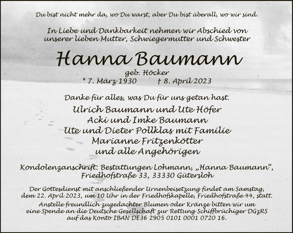 Hier finden Sie alle Traueranzeigen aus der Zeitung, die bisher für Hanna Baumann erschienen sind. Weitere Traueranzeigen, die in der Zeitung erscheinen, werden hier ebenfalls aufgelistet