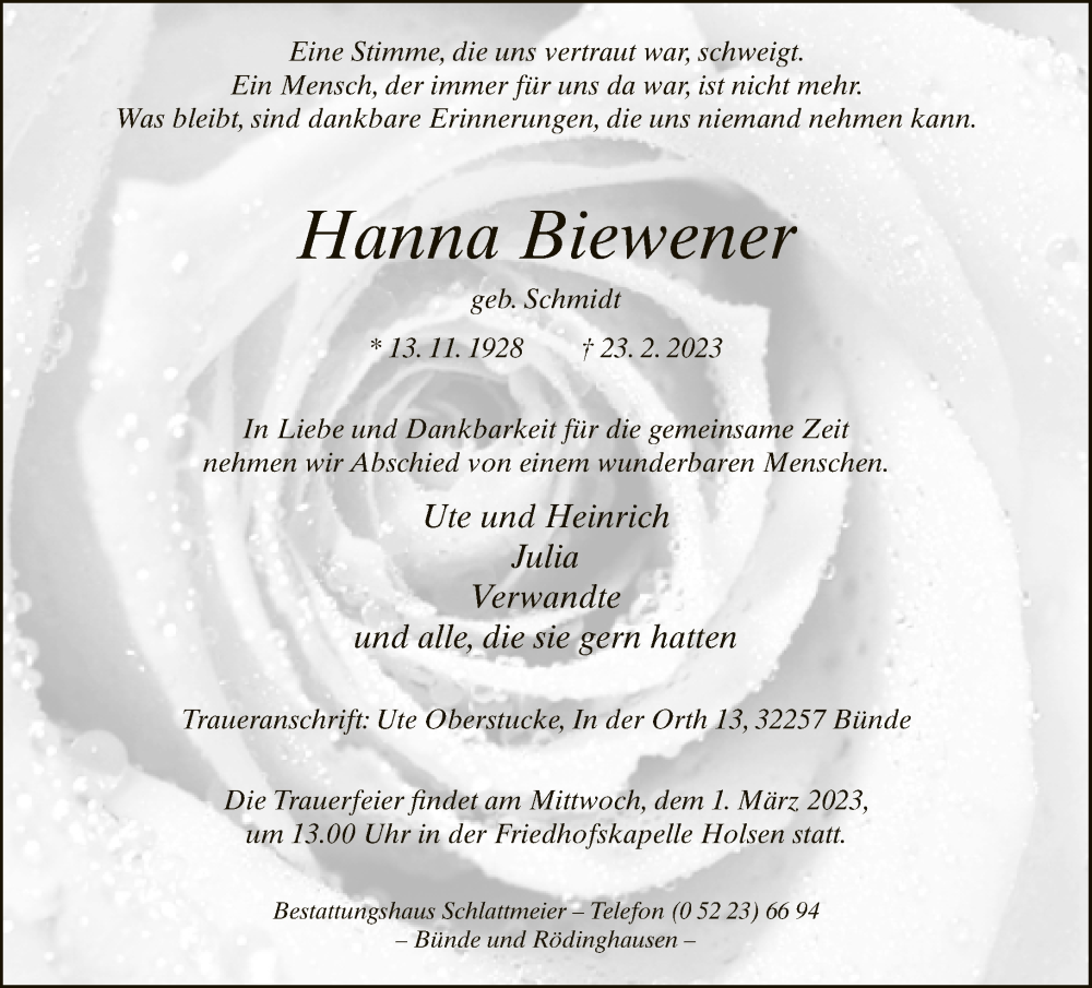 Hier finden Sie alle Traueranzeigen aus der Zeitung, die bisher für Hanna Biewener erschienen sind. Weitere Traueranzeigen, die in der Zeitung erscheinen, werden hier ebenfalls aufgelistet