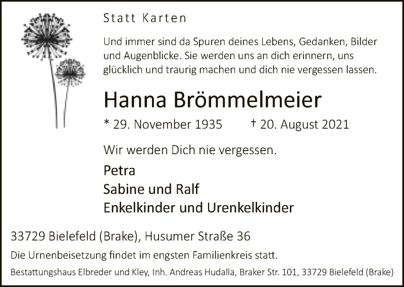 Hier finden Sie alle Traueranzeigen aus der Zeitung, die bisher für Hanna Brömmelmeier erschienen sind. Weitere Traueranzeigen, die in der Zeitung erscheinen, werden hier ebenfalls aufgelistet