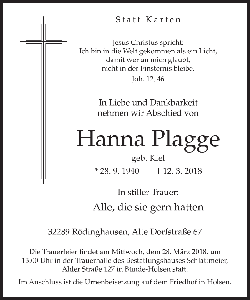 Hier finden Sie alle Traueranzeigen aus der Zeitung, die bisher für Hanna Plagge erschienen sind. Weitere Traueranzeigen, die in der Zeitung erscheinen, werden hier ebenfalls aufgelistet