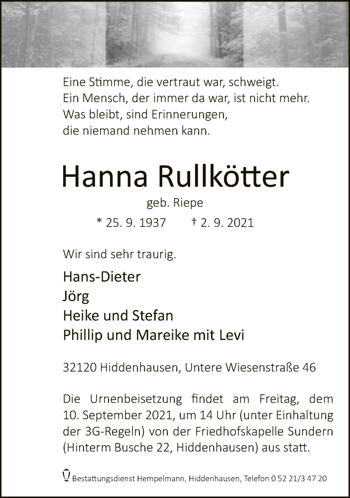 Hier finden Sie alle Traueranzeigen aus der Zeitung, die bisher für Hanna Rullkötter erschienen sind. Weitere Traueranzeigen, die in der Zeitung erscheinen, werden hier ebenfalls aufgelistet
