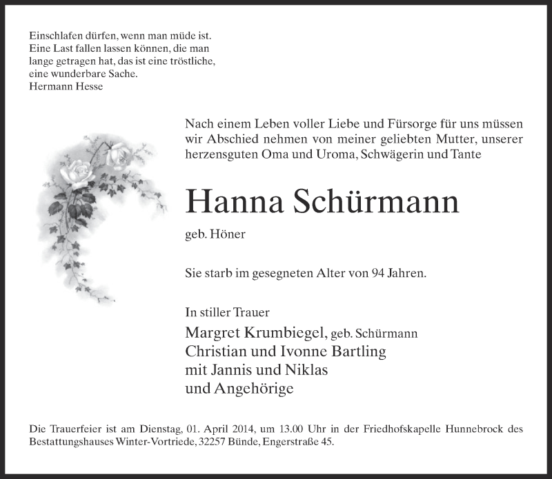 Hier finden Sie alle Traueranzeigen aus der Zeitung, die bisher für Hanna Schürmann erschienen sind. Weitere Traueranzeigen, die in der Zeitung erscheinen, werden hier ebenfalls aufgelistet