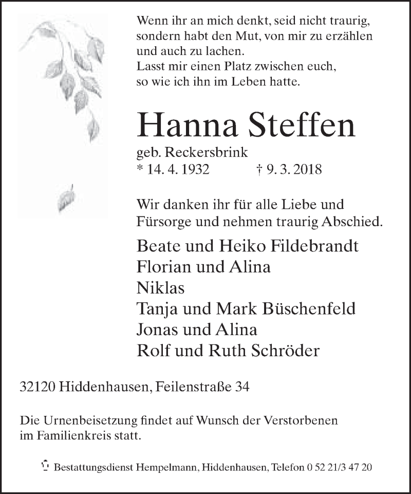 Hier finden Sie alle Traueranzeigen aus der Zeitung, die bisher für Hanna Steffen erschienen sind. Weitere Traueranzeigen, die in der Zeitung erscheinen, werden hier ebenfalls aufgelistet