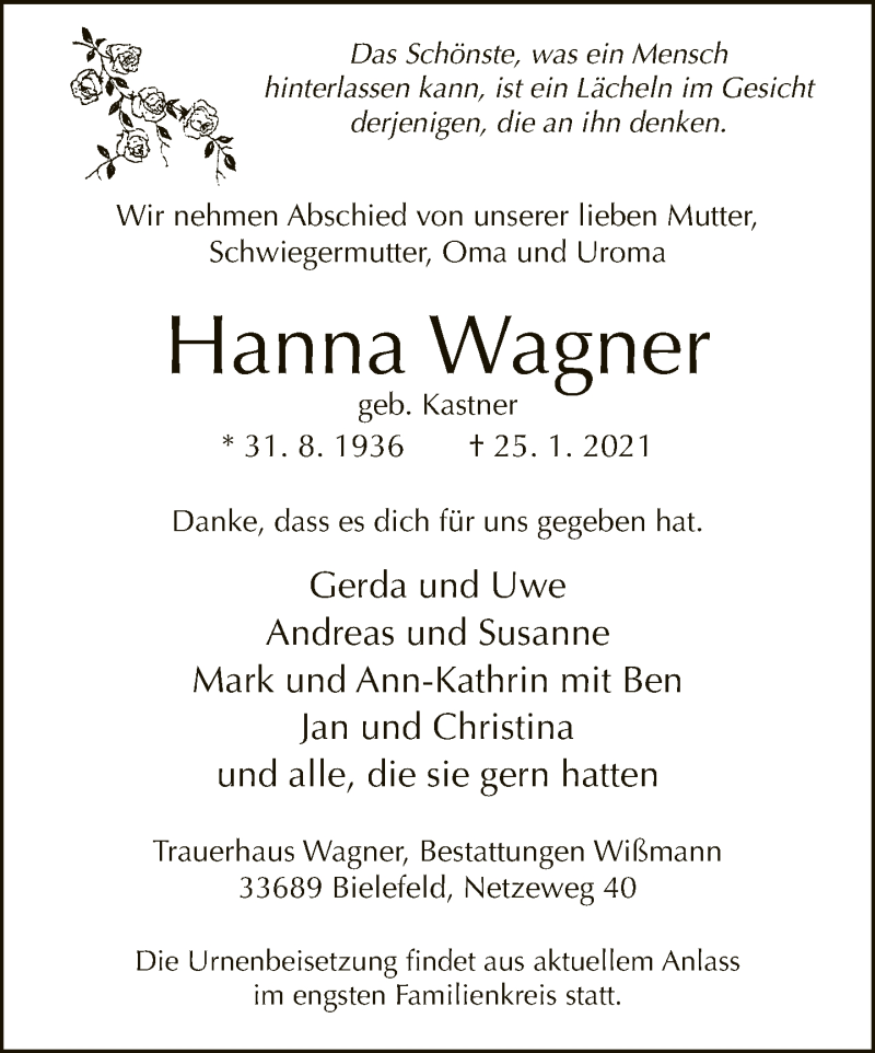 Hier finden Sie alle Traueranzeigen aus der Zeitung, die bisher für Hanna Wagner erschienen sind. Weitere Traueranzeigen, die in der Zeitung erscheinen, werden hier ebenfalls aufgelistet
